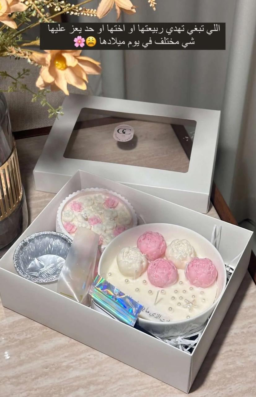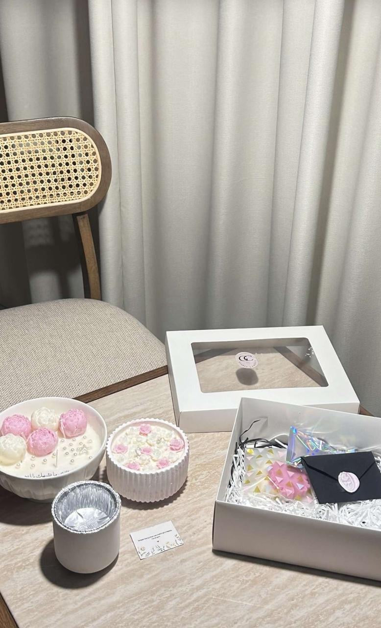 Box with a large glass-plate candle with message and flowers, a medium candle with simple flowers, and a concrete incense burner and massage card ( you have to choose a massage for the candle)